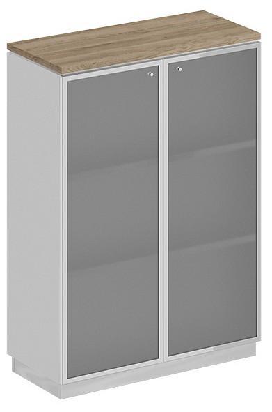 Тумба состоит из стеллажа, топа, цоколя и стеклянных дверей в алюминиевой рамке.