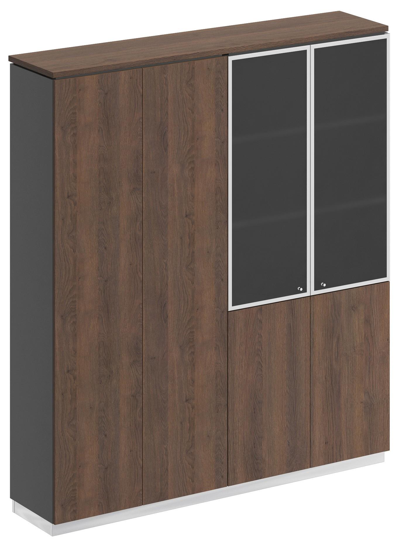 Шкаф состоит из шкафа для документов со стеклом и закрытого шкафа для документов под общим топом, цоколя и дверей.