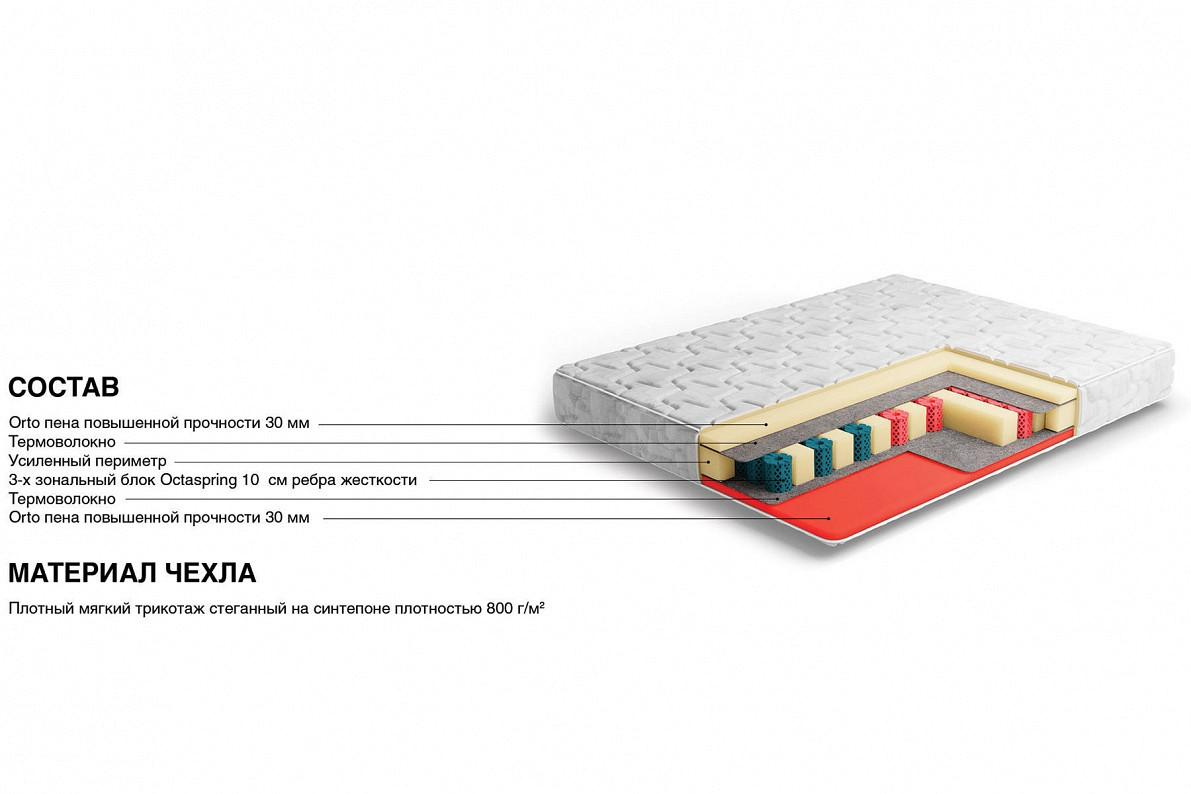 Высокая жесткость матраса достигается за счет сочетания верхнего комфортного слоя из высокоплотной пены Sky Cell и дополнительных ребер жесткости в основе матраса.Пена Sky Cell дарит упругую поддержку и комфортную высокую жесткость. Она прекрасно распределяет нагрузку и обеспечивает качественную опору каждой части тела человека. Ребра жесткости из высокоплотной пены по всей площади матраса обеспечивают уникальную упругость, дарящую здоровый сон и заряд бодрости на весь день. Повышенная воздухопроницаемость пружин Octaspring обеспечивает комфортную свежесть спального места на протяжении всей ночи.