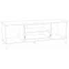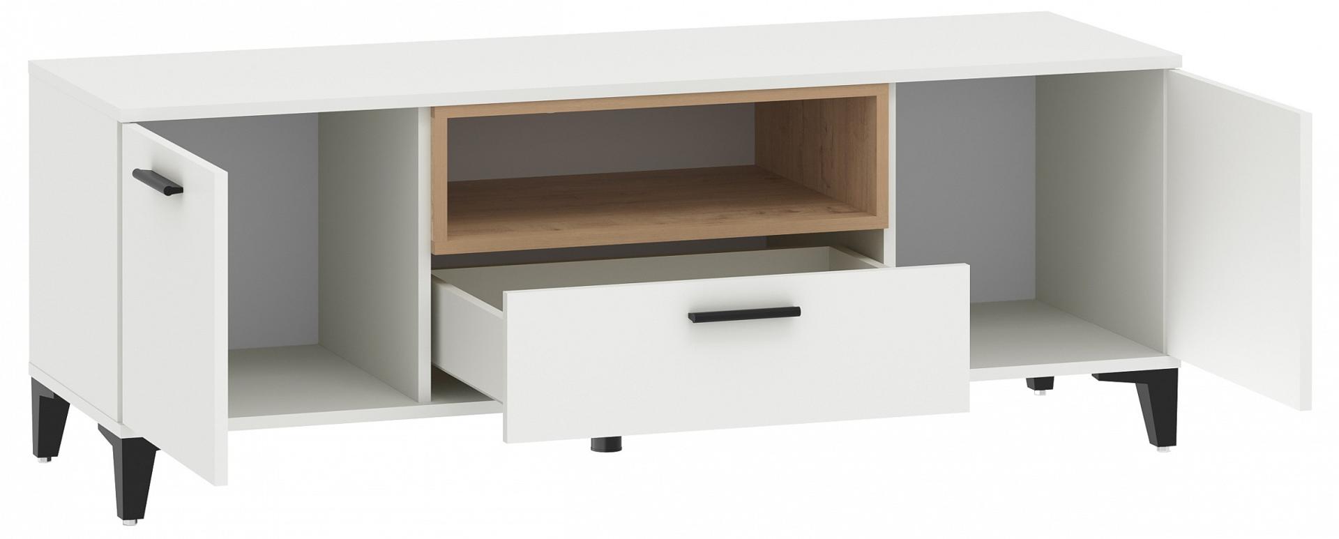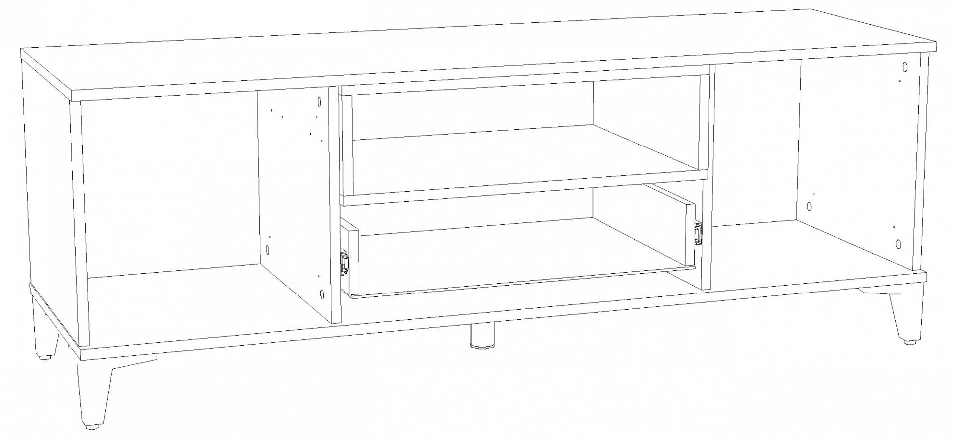 Тумба под ТВ с выдвижным ящиком на шариковых направляющих, с двумя распашными дверцами и открытой полкой.