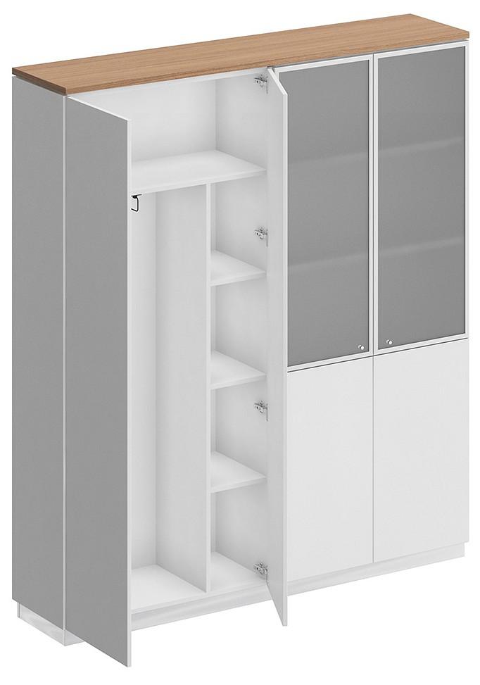 Шкаф состоит из шкафа для документов со стеклом и шкафа для одежды с дополнением под общим топом, цоколя на 2 шкафа и дверей.