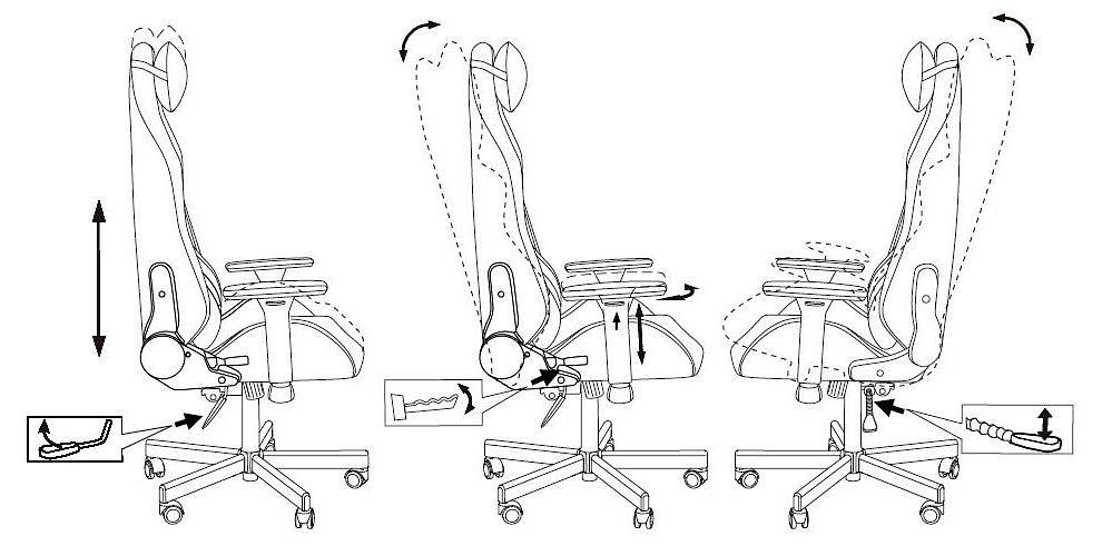Механизм качания с возможностью фиксации в любом положении (топган-люкс). Регулировка высоты (газлифт). Регулировка угла наклона спинки (реклайнер 90-150 градусов). Поддержка шеи и поясницы (2 эргономичные подушки). Подлокотники пластиковые 3D. Каркас стальной. Крестовина металлическая разборная. Колеса для паркета и ламината.