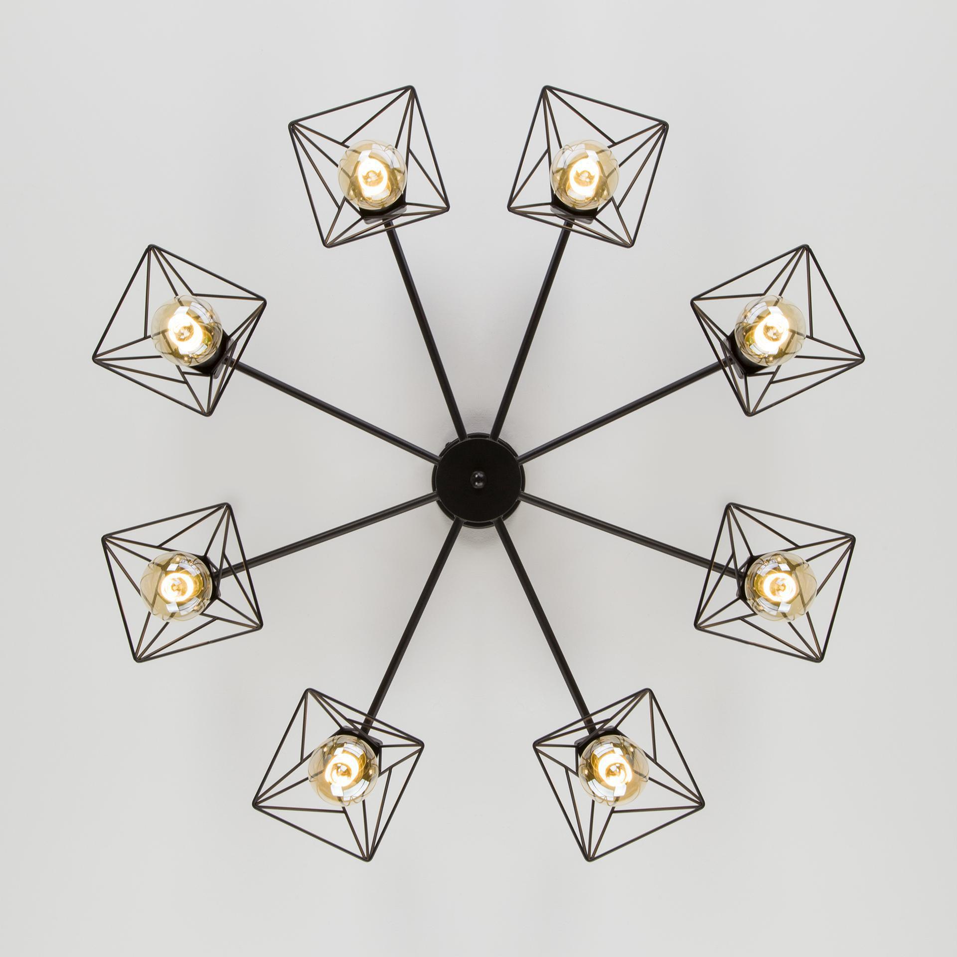 Украсить ваше потолочное пространство и создать качественное освещение на площади 36 м кв. поможет стильная люстра в стиле loft. Строгий внешний вид и конструктивная простота форм добавят в современный интерьер индустриального стиля, а гармоничный цветовой тандем из черного цвета и ламп теплого свечения подчеркнут его. В восьмирожковой люстре используются сменные лампы с цоколем E27, рассчитанные на максимальную мощность 60 Вт. Потолочный светильник оснащен металлическими плафонами. В производстве люстры использован высококачественный металл с надежным защитным покрытием. В интернет-магазине Минимир вы сможете купить потолочную люстру с доставкой по Москве, Санкт-Петербургу и России.